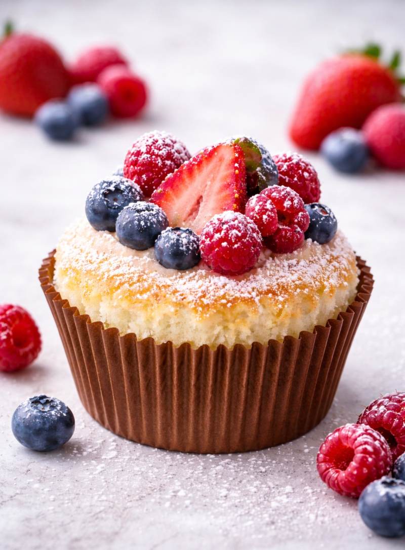Angel Food Cake topped with fresh berries and dusted with fresh powdered sugar.